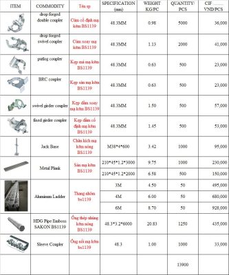 Bảng báo giá chi tiết GIÀN GIÁO BS1139 đầy đủ các thiết bị, bộ phận cấu tạo. Bảng giá mới nhất được Sakon công bố thực hiện lắp đặt, thi công trên toàn quốc.
